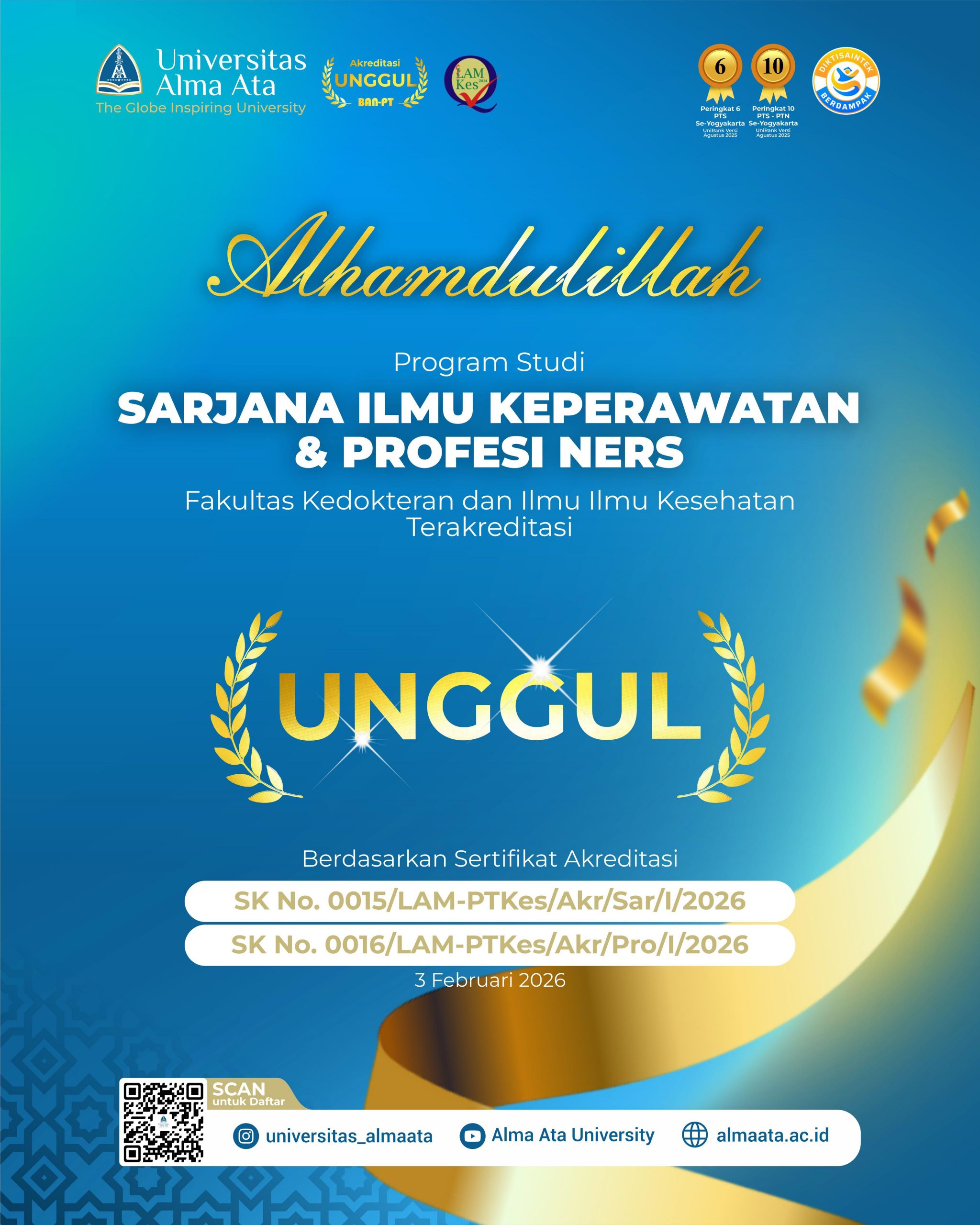 Program Studi S1 Keperawatan Universitas Alma Ata telah meraih akreditasi Unggul sebagai pengakuan atas mutu penyelenggaraan pendidikan yang sesuai dengan standar nasional.